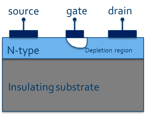 The basic principle of operation of a HEMT is similar to the MESFET, with current flowing between source and drain modulated by the gate voltage. The structure differs in that several different III-V alloy materials are combined together exploiting their unique electrical characteristics to form a conductive region within the channel, commonly referred to as a two-dimensional gas, or 2DEG. In the cartoon, the 2DEG is indicated as a dotted line. An epitaxial process joins the different materials into a complex vertical structure engineering the electronic structure with atomic level precision.