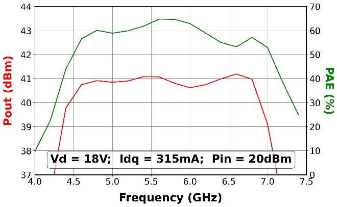 The CHA8107–QCB is a two-stage GaN High Power Amplifier for the 4.5 – 6.8GHz frequency band. This HPA operates with a drain voltage from 14V to 24V. Depending on the applied drain voltage, this HPA provides between 8W and 20W of saturated output power associated with 58% Power Added Efficiency on average across the frequency band.
